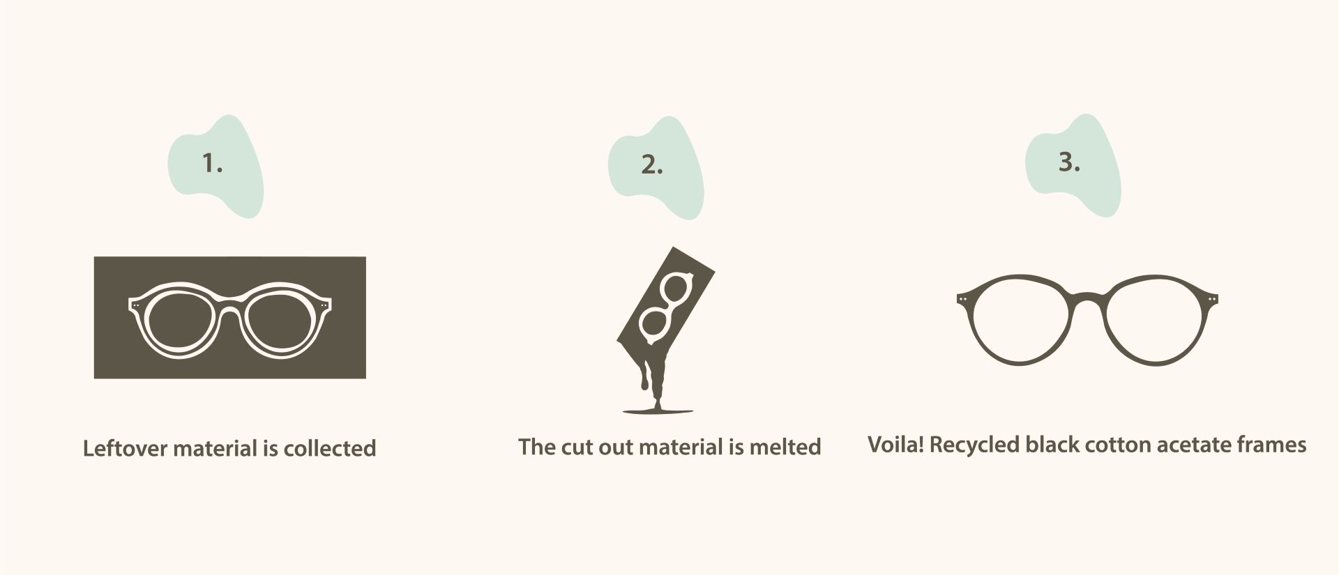 Vores sorte bomuldsacetatstel er lavet af vores restmaterialer, vi forvandler det nye materiale til en rig blanding af uigennemsigtig sort. I stedet for at sende vores udskæringer til en losseplads, bliver de gensmeltede rester fra vores produktion forvandlet til nye blanke sorte stel.